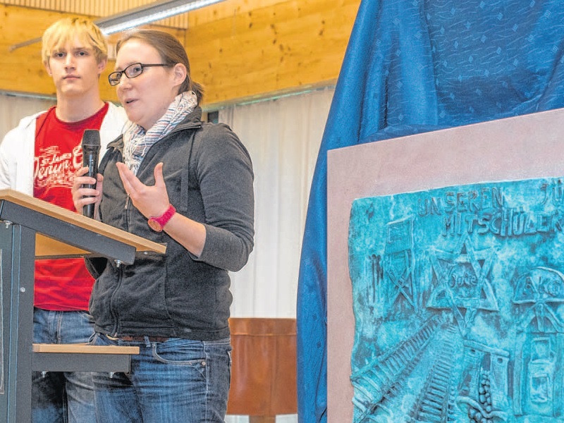 Foto: Paula Sippel und Felix Richter erläuterten die Entstehung und Gestaltung der Bronzetafel (Thomas Neu, Bergsträßer Anzeiger v. 13.11.2009)