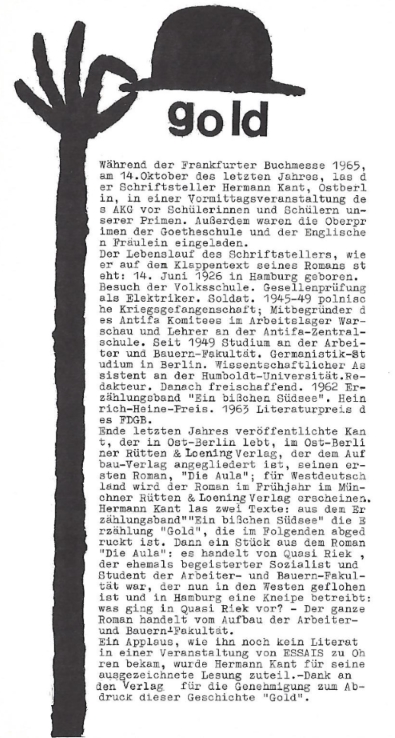 Bericht von einer Lesung des DDR-Autors Hermann Kant im AKG. Sie fand im Rahmen der literarischen Vortragsreihe "Essais" statt. Der Titel "Gold" bezieht sich auf eine Geschichte Kants, die der "Kurfürst" im Anschluss an den Bericht abdruckte.
