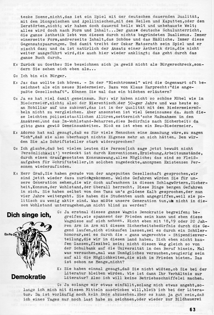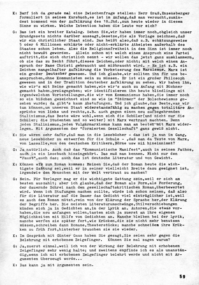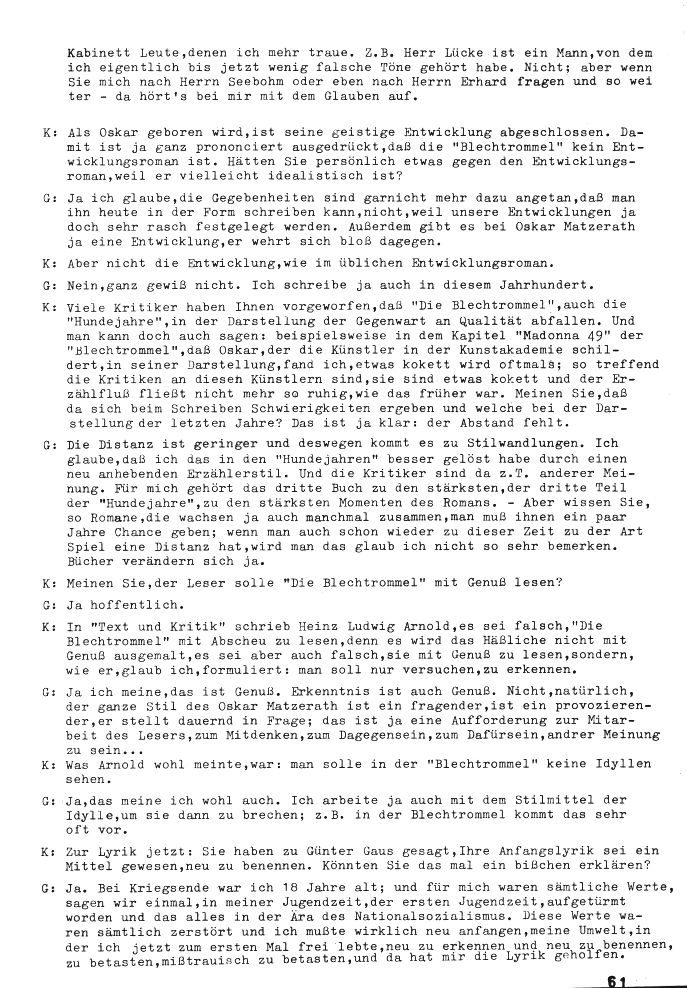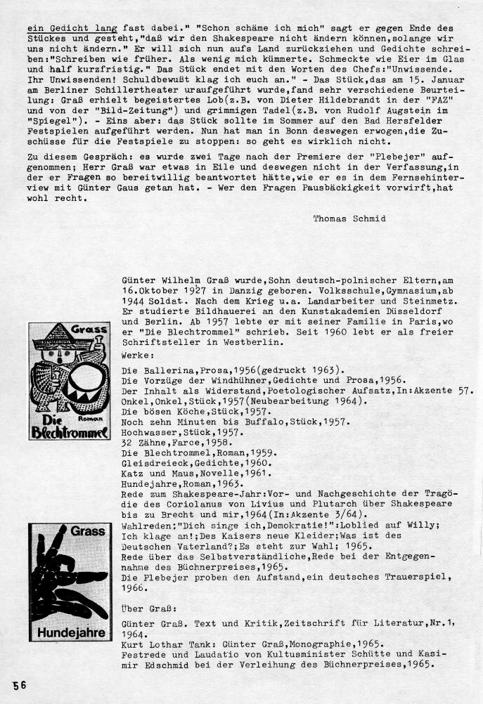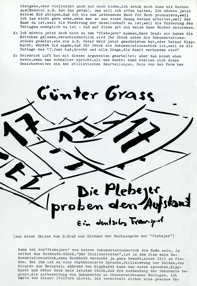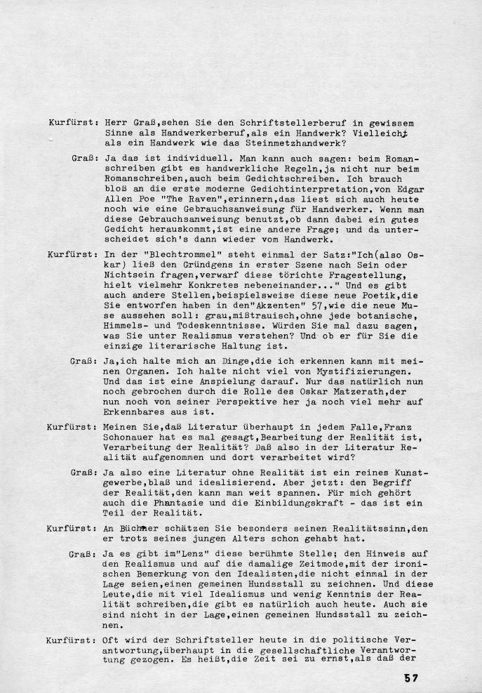 Quelle: Dieter Schiefelbein, Thomas Schmid, Michael Steiner: Gespräch mit Günter Grass. In: Kurfürst 8/9-1966, S. 52-65