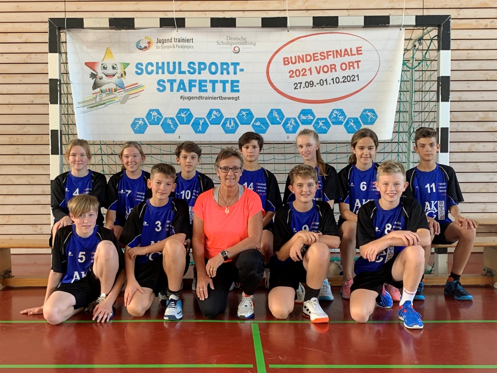Die Handball-Schulmannschaft des Bensheimer Gymnasiums wurde Bundessieger im Wettbewerb „Jugend trainiert für Olympia“, hat sich mit einer ganz starken Leistung im Finale die Goldmedaille geholt. Allerdings fand das Finale diesmal nicht in Berlin statt, sondern Corona-konform in diesem Jahr als „Bundesfinale vor Ort“ in den heimischen Sporthallen als Vielseitigkeitswettbewerb. Zuerst feierte das AKG-Team die hessische Landesmeisterschaft der Schulmannschaften der Jahrgänge 2008 und jünger und schon dies war ein großer Erfolg. Dass es dann aber nach intensiver Vorbereitung im Finale unter den 32 besten Schulen Deutschlands zum ganz großen Wurf reichte, überraschte sogar die Lehrertrainerin Claudia Richter, die gemeinsam mit Thomas Weber die Mannschaft betreute und trainierte.
