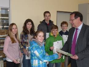 Carlotta Steffens (8s) erreichte Platz 1, Konstantin Bürkle (8b) und Julian Sauer (8s) landeten punkgleich auf Rang 2, Laura Mößner (8e) und Tim Wenzelburger (8s) teilten sich den 4. Platz, Leonie Knaup (8e) schaffte es auf Rang 6. Im Rahmen einer kleinen Siegerehrung überreichte Herr Wecht den erfolgreichen Rechnern eine Urkunde und einen kleinen Preis. Der Schulsieg bedeutet für die sechs Schülerinnen und Schüler zugleich die Qualifikation für die nächste Runde, den Kreisentscheid, der im März am AKG stattfinden wird.