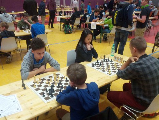 Doch anstatt die Köpfe hängen zu lassen, rotierten die AKG-Schüler ihre Mannschaftsaufstellung wie vorher abgesprochen und fuhren in den kommenden Runden Sieg um Sieg auch gegen die spielstarken Teams aus Kassel und Rüsselsheim ein. In der vorletzen Runde wurde es dann noch einmal besonders spannend gegen das Team vom Gymnasium aus Viernheim. Während im letzten Jahr bei diesem Duell noch die Bensheimer knapp erfolgreich waren, machte sich in diesem Jahr das Fehlen von Phil Thomsen an Brett 1 auf Bensheimer Seite bemerkbar – das AKG-Team musste sich den Viernheimern nach umkämpften Partien mit 1:3 geschlagen geben und vergab somit vor der entscheidenden letzten Runde bereits rechnerisch die Chance auf den Gesamtsieg. Durch eine starke Leistung in der letzten Runde konnte sich die Mannschaft des AKG jedoch den insgesamt sehr beachtlichen zweiten Platz in der Gesamtwertung sichern. Besonders hervorzuheben war an diesem Tag die Leistung von Mei Linh Le, die trotz ihres noch jungen Alters 5 ihrer 6 gespielten Partien an Brett 3 bzw. 4 gewinnen konnte und damit die beste Erfolgsquote im AKG-Team hatte.