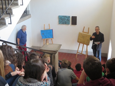 Die Entstehung der Bronzetafeln geht zurück auf eine Anregung von Jochen Burhenne, der Kunst und Politik unterrichtet. Er erläuterte den Gestaltungsprozess, der von mehreren Entwürfen über Gipsmodelle und eine Negativform bis zur Gießerei führte.
