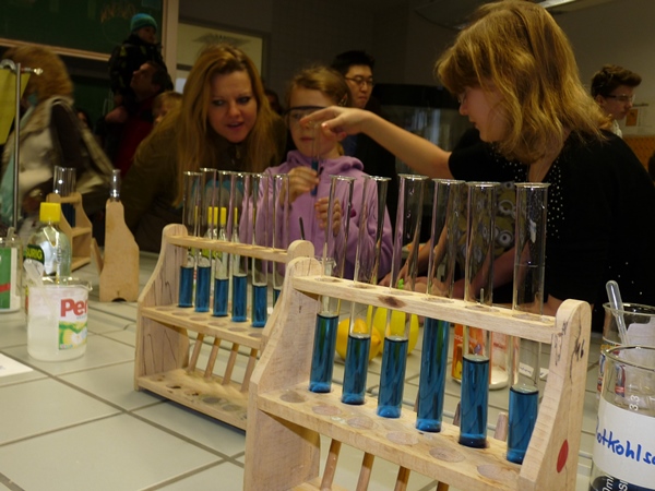 Dafür waren am Samstag, dem 24. Januar, Klassen- und Fachräume geöffnet: Neben Informationen zu Deutsch und den Fremdsprachen gab es in den Fachräumen der Biologie, Chemie, Physik und Informatik die Möglichkeit, kleine Experimente durchzuführen. Aktiv werden konnten die jungen Besucher auch im Musikraum, wo verschiedene Instrumente zum Ausprobieren ausgestellt wurden. In der Turnhalle gab es für die Grundschüler verschiedene Sportangebote, die gerne genutzt wurden. Zurücklehnen und staunen durften die Besucher bei einer spektakulären Chemie-Show sowie einer Latein-Theater-Vorführung.