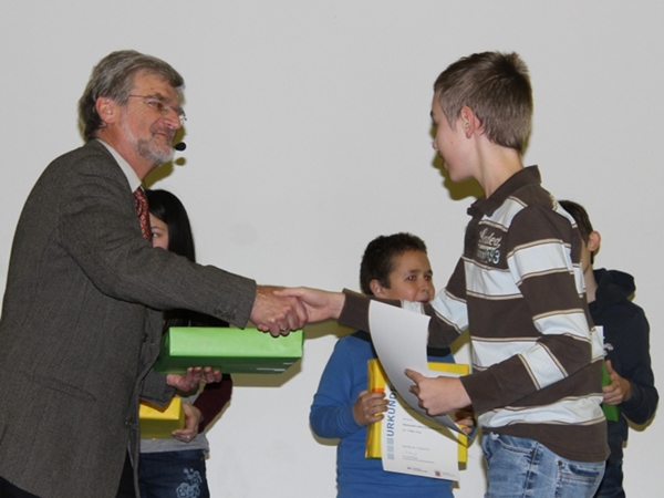 Da ein Korrekturausschuss die Arbeiten jeweils direkt im Anschluss auswertete, konnten noch am Samstag die Ergebnisse veröffentlicht und die Sieger geehrt werden. Die Preisverleihung erfolgte u.a. durch Prof. Martin Kiehl von der TU Darmstadt und Rolf Nothnagel, Vorstandssprecher des austragenden Vereins "Zentrum für Mathematik" (im Bild).
