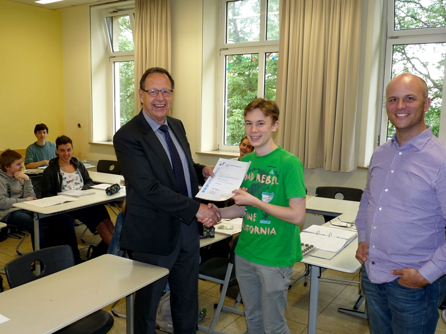 Der Mathematik-Vorleistungskurs von Herrn Krumb erhielt Besuch vom Schulleiter: Herr Wecht überreichte eine Urkunde und einen Preis an Johannes Opfermann, der beim diesjährigen Mathematik-Wettbewerb der Einführungsphase Schulsieger wurde.