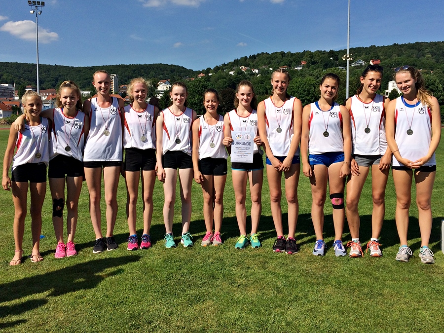 Solide Leistungen im Sprint, beim Weitsprung und in der abschließenden 4x75-Meter-Staffel ergaben am Ende 6739 Punkte und brachten die Silbermedaille für das AKG. Landessieger wurde die favorisierte Schwingbachschule aus Rechtenbach mit starken 7119 Punkten. Bronze ging an die Taunusschule Hofheim mit 6658 Punkten. „Auch eine gesunde Luisa Wolf hätte heute nicht gereicht um das Team aus Rechtenbach zu schlagen. Das müssen wir neidlos anerkennen. Silber war das Maximum und das haben unsere Mädchen eindrucksvoll geschafft“, zeigten sich Lehrer-Trainer Markus Forster und Betreuerin Ines Harjes nach dem Wettkampf zufrieden mit der Leistung ihrer Mannschaft.