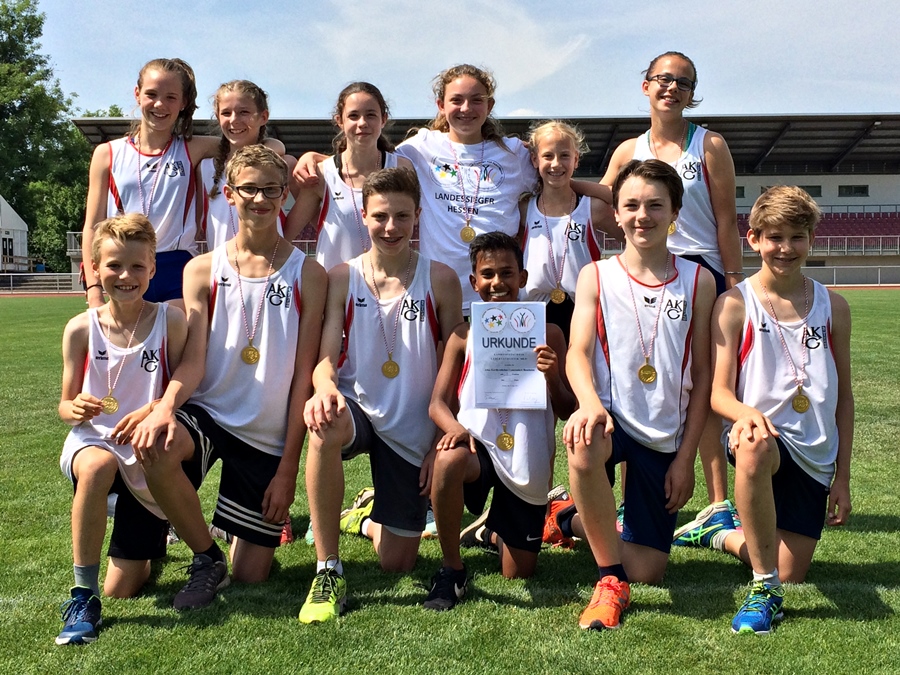 Die besten neun Schulmannschaften Hessens nahmen am Landesfinale in Wetzlar teil. Im WK IV bilden jeweils sechs Mädchen und Jungen eine Mannschaft. Von den fünf Disziplinen, die von allen zwölf Mannschaftsmitgliedern absolviert werden müssen und bei denen jeweils fünf Mädchen und Jungen in die Wertung kommen, konnte das AKG allein drei Disziplinwertungen für sich entscheiden. Den Weitsprung, den Wurf mit dem 200-Gramm-Ball sowie die Pendelstaffel. Dabei überzeugte beim Ballwurf vor allem Jonas Helfrich mit 54,5 Meter. Bei den Mädchen kam hier Emily Herrmann auf starke 40,5 Meter. Im Weitsprung glänzten David Hügel mit 4,86 Meter und Julius Knatz mit 4,85 Meter. Und obwohl man im 50-Meter-Sprint „nur“ den vierten Platz unter den neun Final-Teams belegte, gelang der Sieg mit der Staffel dank ausgezeichneter Wechsel. Beim abschließenden Zehn-Minuten-Lauf, der wegen der hohen Temperaturen um zwei Minuten verkürzt wurde, war dann bei 32 Grad noch einmal enorme Willenskraft gefragt. Mit einer geschlossenen Team-Leistung und Rang zwei in der Disziplinwertung machte das AKG mit insgesamt neun Ranglistenpunkten den Landessieg perfekt. Zweiter wurde mit 13 Ranglistenpunkten die Rhenanus-Schule Bad-Sooden-Allendorf vor der Georg-Büchner-Schule aus Darmstadt mit 18 Punkten.