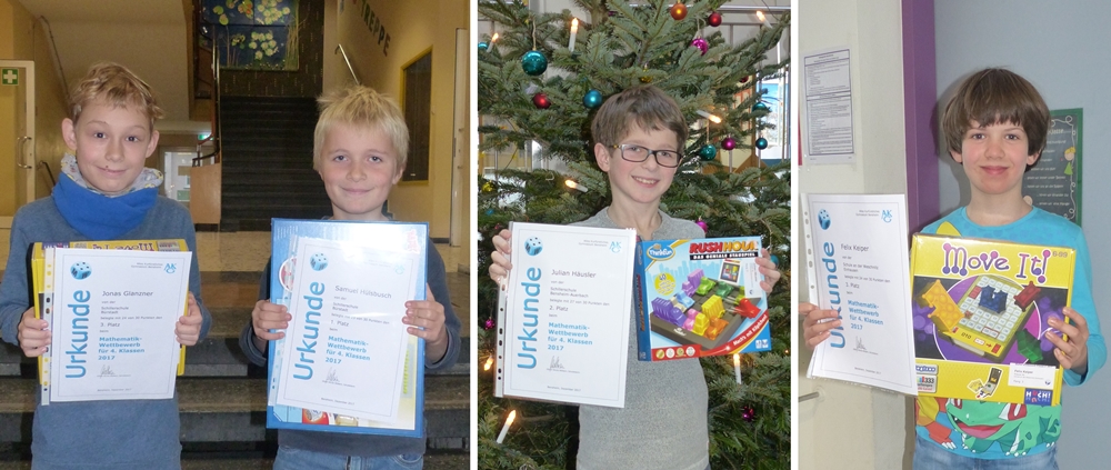Anfang Dezember besuchte eine Vertreterin des AKG die Grundschulen und gratulierte den vier besonders erfolgreichen Teilnehmern persönlich. Dabei überreichte sie den Siegern als Anerkennung ihrer besonderen Leistung eine Urkunde und einen Preis. Die Wettbewerbs-Ergebnisse der übrigen Teilnehmer wurden zusammen mit weiteren Urkunden und kleinen Preisen jeweils an die 18 beteiligten Grundschulen verschickt. Finanziert wird der Wettbewerb vom Förderverein des AKG.