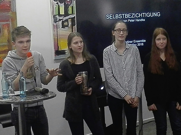 Auch eine Schüler-Jury wird es in diesem Jahr wieder geben. Dabei sind: Hannah Helbig, Leo Reisert, Anna Hedderich, Lea Bohrer und Inken Pallas aus dem Deutsch-LK. Die Schüler-Jury beurteilt jedes Stück und wird am Ende der Woche junger Schauspieler in einer Diskussion entscheiden, welches Gastspiel eine lobende Erwähnung bekommt. Über ihre Entscheidung informieren die Schüler das Publikum und die Theaterschaffenden nach dem letzten Gastspiel im Rahmen der Bekanntgabe der Preisträger für den Günther-Rühle-Preis und des Publikumsvotums.