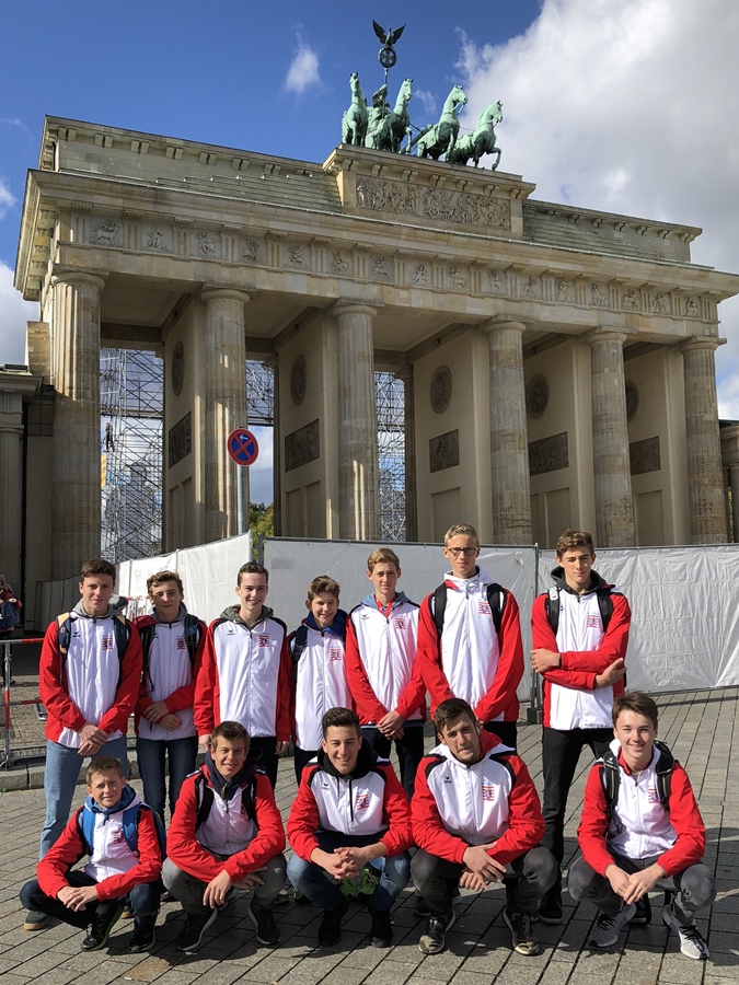 Die Jungen der Wettkampfklasse III (Jahrgänge 2003/2004) des AKG hatten sich durch ihren Landessieg im Juni in Gelnhausen für das Bundesfinale „Jugend trainiert für Olympia“ qualifiziert. Und dieses Finale wird traditionell in der Hauptstadt ausgetragen. Eine einstellige Platzierung hatte sich das Team von Lehrer-Trainer Markus Forster für den Wettkampf im Friedrich-Ludwig-Jahn-Sportpark zum Ziel gesetzt. Und bis zur letzten Disziplin, der 4x 75-Meter-Staffel, war dieses Ziel auch in greifbarer Nähe. Dann passierte das Missgeschick. Beim letzten Wechsel verlor das AKG-Quartett den Staffelstab. Am Ende blieb Platz 13 und die Erkenntnis, dass auf diesem Niveau, auch mit einer gut laufenden zweiten Staffel, ein solcher Fehler nicht mehr auszugleichen ist. Zuvor hatten alle Teilnehmer mit schwierigen äußeren Bedingungen zu kämpfen. Böiger Wind und heftige Regenschauer setzten den jungen Athleten zu. Umso beachtlicher die Sprungleistungen von Nicolas Gelbarth, der zunächst beim Weitsprung seine persönliche Bestleistung (pB) um 30 Zentimeter, auf 5,81 Meter, steigern konnte. Noch beeindruckender war dann allerdings der anschließende Hochsprung-Wettkampf. Der Wind war zeitweise so heftig, dass die Hochsprunglatte ohne Fremdeinwirkung von den Auflageflächen geweht worden war. Wegen Starkregens musste der Wettkampf sogar unterbrochen werden. Doch Nicolas ließ sich davon nicht beeindrucken und sprang unter diesen Bedingungen ausgezeichnete 1,65 Meter hoch. Ebenfalls überzeugen konnte hier Benjamin Gang mit neuer pB von 1,53 Meter. Weitere gute Leistungen im AKG-Trikot erzielten Tim Cremer mit 9,98 Sekunden über 75 Meter, Philipp Nitsch (2:15,82 Minuten) und Jonas Helfrich (2:16,24 Minuten) über 800 Meter sowie Bastian Seitz mit 11,09 Meter im Kugelstoßen.