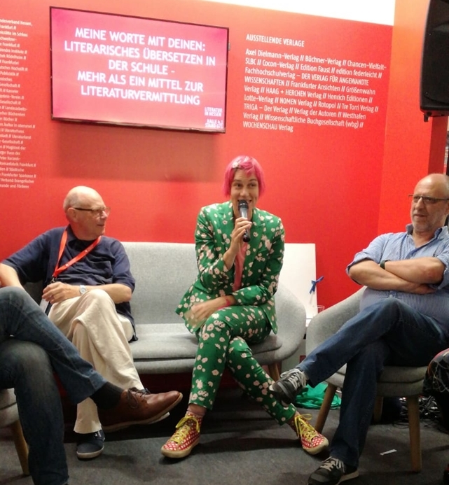 Im Rahmen des Erasmus+-Programms mit unseren beiden Partnerschulen in Ferrara wurde das Projekt am 12.10. 2018 auf der Frankfurter Buchmesse vorgestellt. Am Stand des Hessischen Literaturrats hatten sich nicht nur die italienischen und deutschen Kooperationspartner eingefunden, auch zahlreiche Kolleginnen des AKG und die Schulleiterinnen Mara Salvi und Nicola Wölbern waren anwesend.