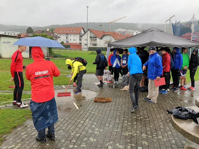 Die ganze „Dramaturgie“ des Wettkampfs lässt sich schwer beschreiben. Noch vor Beginn des Aufwärmens fing es an zu regnen. Der Niederschlag intensivierte sich, teilweise schüttete es wie aus Eimern. Dadurch fanden die 100 Meter, der Weitsprung, das Kugelstoßen und das Speerwerfen unter sehr schwierigen Verhältnissen statt. Alle Teilnehmer, Betreuer und auch die Kampfrichter waren klatschnass. Aus dem Kugelstoß-Ring musste immer wieder das Wasser gekehrt werden, die Anlaufbahnen für Weitsprung und Speerwurf waren rutschig. Den Hochsprung hatte die Wettkampfleitung aus Sicherheitsgründen abgebrochen und auf den Nachmittag verschoben.