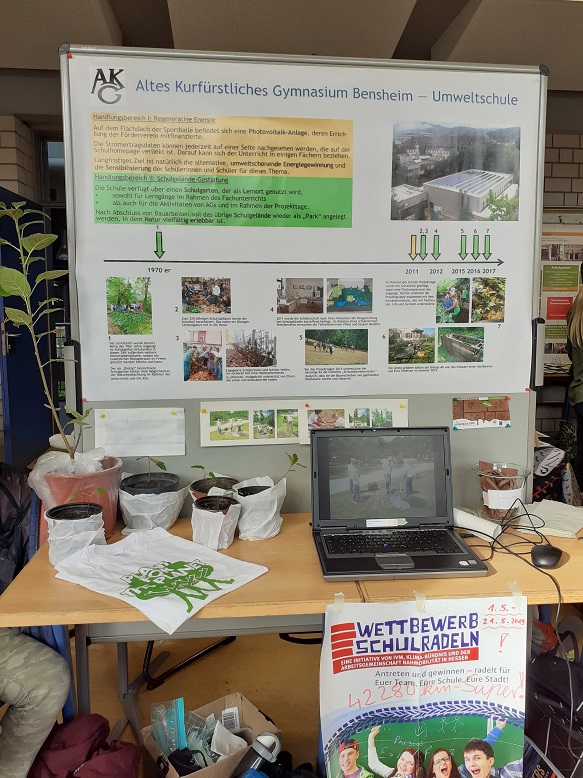Mit unserem Info-Stand informierten wir über einige unserer Maßnahmen zum Klimaschutz, zum Beispiel die Teilnahme und das sehr gute Abschneiden des AKG beim Schulradeln. Oder das Engagement der Klimabotschafter, die in fünften und sechsten Klassen Vorträge über Klimawandel gehalten hatten. Schülerinnen und Schüler, die sich neu zu Klimabotschaftern ausbilden lassen wollten und sich zur Akademie der Organisation „Plant forthe Planet“ in Ludwigshafen angemeldet hatten, starteten mit Frau Dönicke als AKG-Gruppe dorthin gemeinsam vom Bensheimer Bahnhof aus.