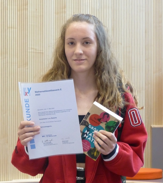 Bereits zum 21. Mal wurde in diesem Jahr der landesweite Mathematik-Wettbewerb für die Einführungsphase durchgeführt. Das beste Ergebnis am AKG erreichte in diesem Jahr Anastasia Lou Baierle, die nicht nur den Schulsieg errang, sondern mit 54 von 60 Punkten auch deutlich über dem hessenweiten Schnitt von 26,4 Punkten lag.