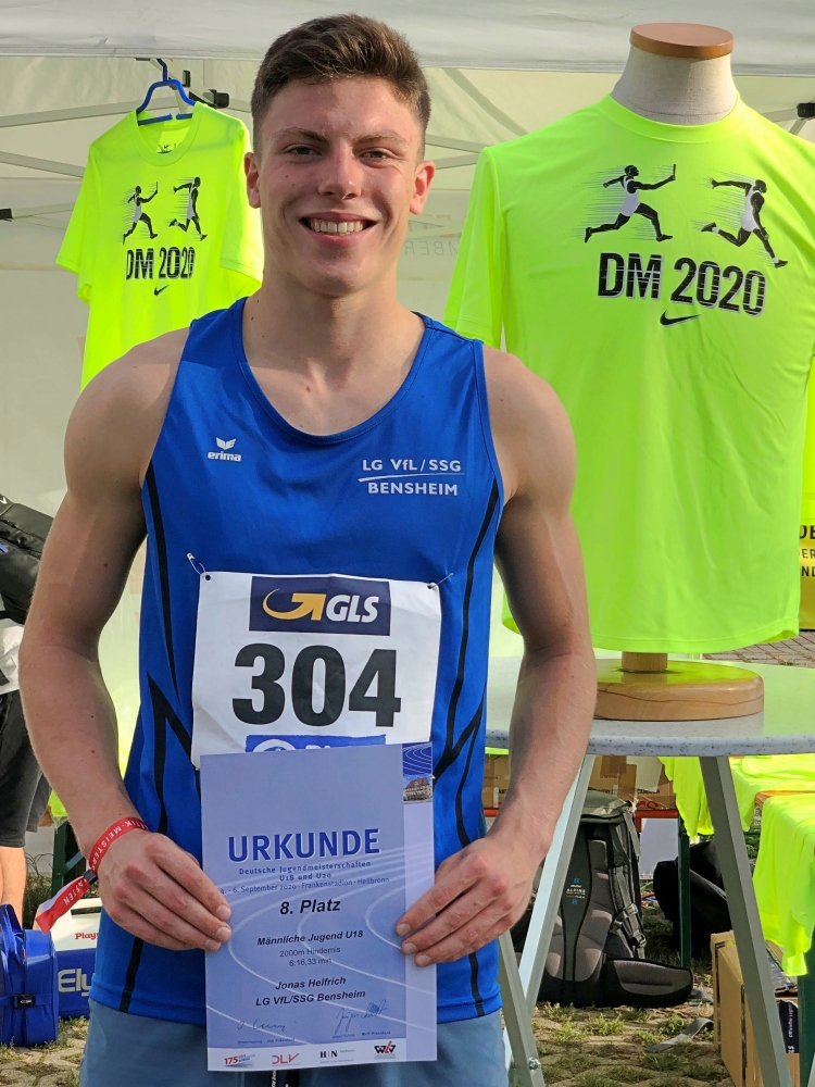 Denn direkt nach erfolgreich gelaufener Qualifikation, Ende Juli beim Rennen in Karlsruhe, musste der U18-Athlet der LG VfL/SSG Bensheim eine fast dreiwöchige Verletzungspause einlegen. Zur echten Vorbereitung auf die nationalen Titelkämpfe im Heilbronner Frankenstadion blieben so nur knapp zwei Wochen. Eigentlich zu wenig, um dort größere Erwartungen erfüllen zu können. Umso überzeugender ist sein Auftritt im Finale der 14 besten DLV-Athleten zu bewerten. Eine couragierte Renngestaltung mit hohem Angangstempo wurde im Ziel mit Platz acht und einer deutlichen Steigerung der persönlichen Bestleistung belohnt. In sehr guten 6:16,33 Minuten unterbot Jonas seine Zeit aus Karlsruhe um mehr als neun Sekunden. Den deutschen Meistertitel in einem stark besetzten Feld sicherte sich Kurt Lauer vom LAZ Ludwigsburg, der in 5:57,84 Minuten sogar unter der magischen Sechs-Minuten-Grenze blieb.