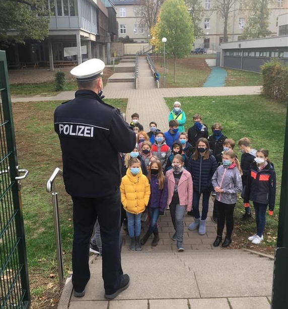 Der Polizist Herr Runzheimer besuchte Mitte Oktober an drei Tagen das AKG und thematisiert mit allen sechs Sextaner-Klassen jeweils eine Doppelstunde lang Aspekte des Schulwegs, insbesondere Gefahrenpunkte rund um die Schule. Zunächst im Klassenraum und bei bestem Wetter anschließend auch vor Ort im Freien wurden die Schülerinnen und Schüler für allgemeine und spezifische Fragen der Verkehrssicherheit sensibilisiert, wobei die Sextaner an vielen Stellen ihre persönlichen Erfahrungen einbringen konnten. Schade nur, dass sich wegen der pandemiebedingten Auflagen nicht - wie sonst üblich - die SchulwegbegleiterInnen des AKG in den jeweiligen Klassen zu Beginn der Doppelstunden vorstellen und von ihren Tätigkeiten berichten konnten.