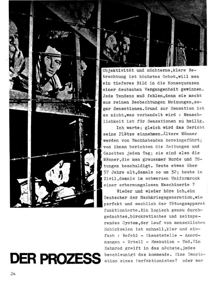 Hintergrund dieses Artikels ist ein Besuch des 1. Auschwitzprozesses (1963-65), den die Klasse des Autors im März 1964 auf Anregung der AKG-Lehrer Volker Claus und Hans-Jörg Geissler unternommen hatte.