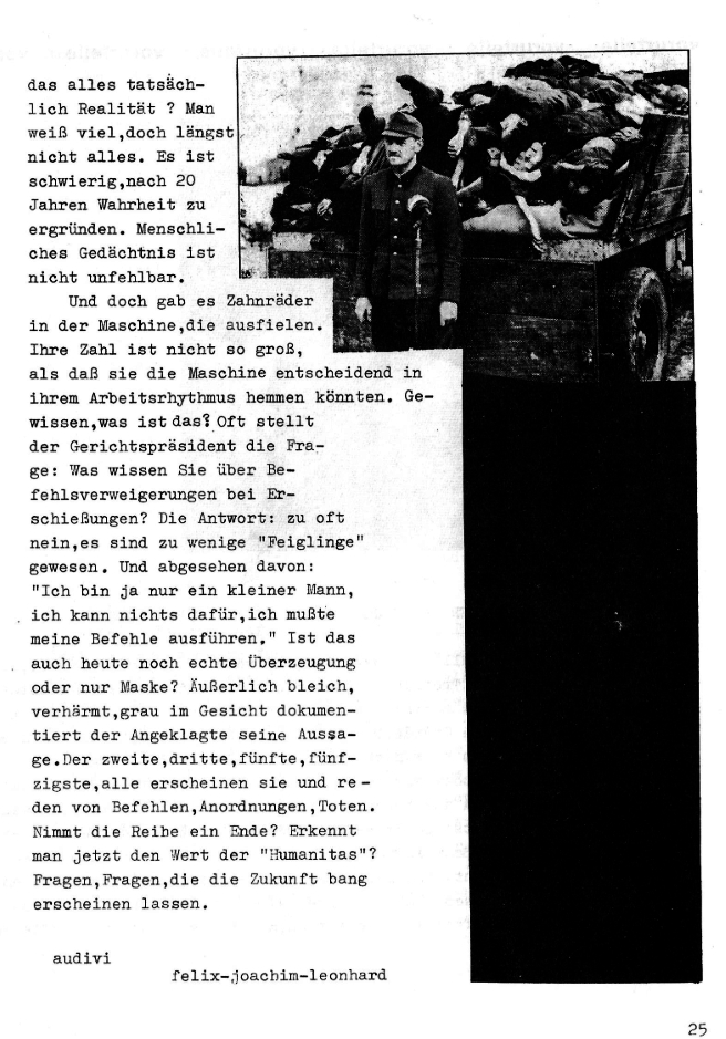 Hintergrund dieses Artikels ist ein Besuch des 1. Auschwitzprozesses (1963-65), den die Klasse des Autors im März 1964 auf Anregung der AKG-Lehrer Volker Claus und Hans-Jörg Geissler unternommen hatte.