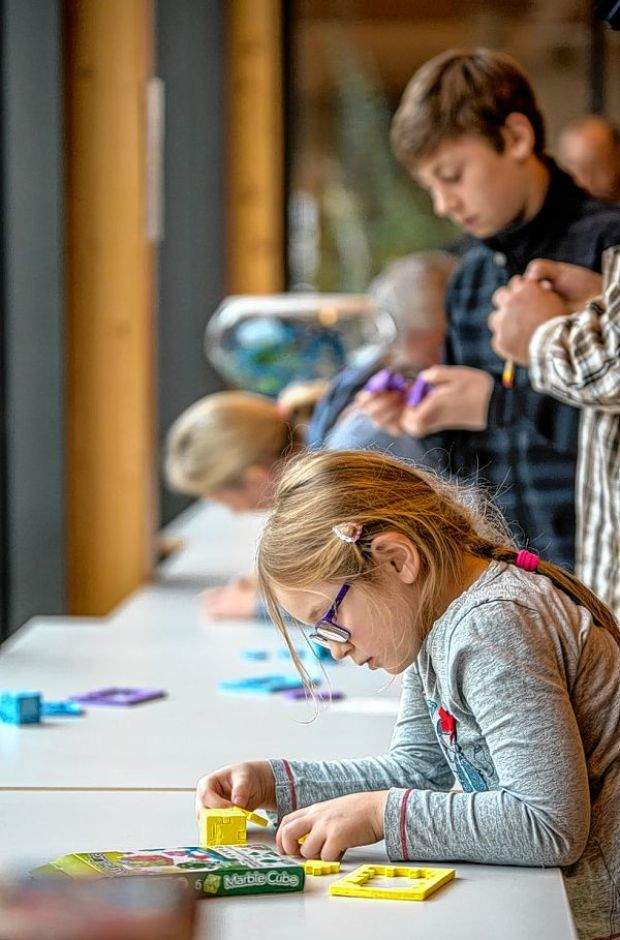 Mathematik zum Anfassen bot auch der Conway-Würfel. Hier galt es, aus unterschiedlich großen Quadern einen Würfel zusammenzusetzen. Durch Ausprobieren ist das nahezu unmöglich. Mit einem gut dosierten Schuss Gehirnschmalz wird es leichter. Auch eine Schätzaufgabe schürte die Spannung.