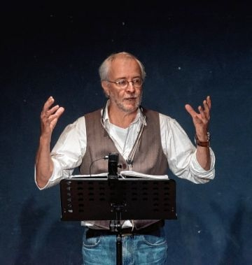 Auf der Bühne des Speichertheaters im Alten Kurfürstlichen Gymnasium (AKG) stand Berthold Mäurer als Solist im Licht der Scheinwerfer. Überzeugend, ohne die eigene Person in den Vordergrund zu rücken, wo notwendig stark in Mimik und Gestik, ansonsten zurückhaltend und immer mit der Stimme in Tempo, Betonung, Lautstärke präzise arbeitend. Kein großes Bühnenbild, kein großer Aufbau waren notwendig, um den Texten, manche auch von Mäurer als Lied vertont, einen Rahmen zu geben.