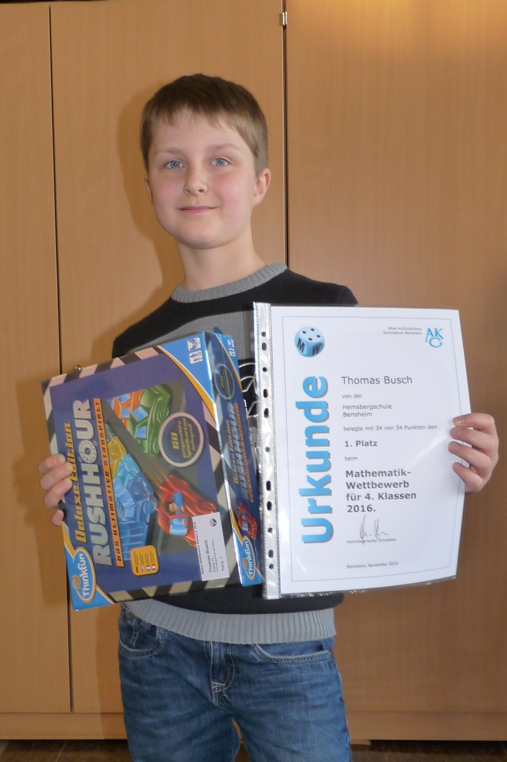 Ende November erhielten nun die Hemsbergschule sowie die Carl-Orff-Schule Besuch von einer Vertreterin des AKG: Esther Schmitt, Fachsprecherin für Mathematik und verantwortlich für die Organisation des Wettbewerbs, gratulierte den vier besonders erfolgreichen Teilnehmern persönlich und überreichte den Siegern als Anerkennung ihrer besonderen Leistung jeweils eine Urkunde und einen Preis.