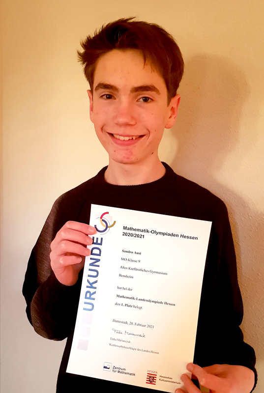 Sandro Aust war dieses Jahr besonders erfolgreich: Er erzielte in der Landesrunde den ersten Platz, wurde damit Hessensieger im Jahrgang 9 und qualifizierte sich für die 4. Runde (Bundesrunde) der Mathe-Olympiade. Ein bisher am AKG einmaliger Erfolg!