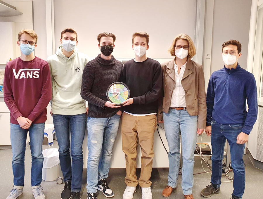 Es war bereits im Frühjahr dieses Jahrs als sich Tilman Arndt, Felix Krampff, Luis Grüttgen, Tobias Rossner und Max Schäfer zusammen mit ihrer Lehrerin Angela Geiger entschlossen, an dem renommierten Wettbewerb teilzunehmen. Mehrere Prüfungsrunden über Hausaufgaben, Klausuren und Labortätigkeiten sind zu bewältigen, an deren Ende ein/e Bundessieger/in eine Woche nach Tianjin, unweit von Peking reisen darf, um dort mit anderen Nachwuchsnaturwissenschaftlern international zusammenzuarbeiten. Der bisher so erfolgreichen Teilnahme verdankt das AKG die neue Uhr im Chemiesaal, dreimal pro Woche zeigt sie zu Beginn des Chemieunterrichts „Viertel vor Fluor“ – nur Schulen mit einer solch hohen Zahl von Qualifizierungen für die zweite Runde erhielten diese Auszeichnung.