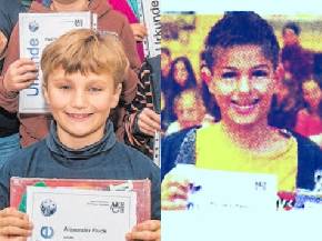 Den Siegern auf den Plätzen 1 bis 3 wurden ihre Preise jeweils von einer Vertreterin des AKG an ihren Grundschulen überreicht. Finanziert werden die Preise vom Förderverein des AKG. Das Bild zeigt die beiden Erstplatzierten bei der Preisübergabe.