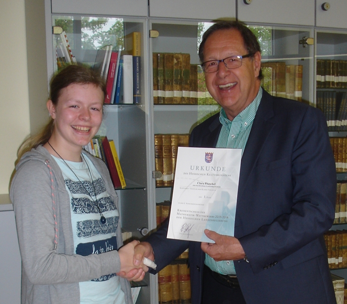 Damit qualifizierte sich Clara für die letzte Wettbewerbsrunde, in der die Landessieger ermittelt werden. Diese fand am 03.05.2016 in Darmstadt statt. Nach der Wettbewerbsklausur am Vormittag folgte am Nachmittag die Siegerehrung der Kreissieger. Aus jedem der 26 Kreise durften die besten zwei – in manchen Ausnahmefällen auch die ersten drei - Kreissieger an dieser 3. Runde teilnehmen. Clara gehört somit schon definitiv zu den knapp 60 besten Wettbewerbsteilnehmern aus ganz Hessen. Die genaue Platzierung des Landesentscheides steht noch nicht fest – wir drücken Clara die Daumen und gratulieren ihr ganz herzlich zu ihrem großen Erfolg!