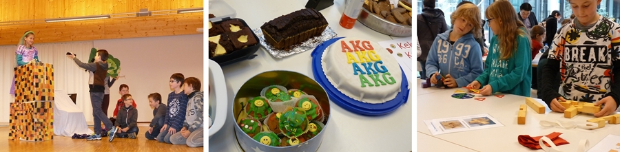 Während sich die Teilnehmer dann für die Wettbewerbsklausur auf mehrere Räume im Altbau verteilten, konnten die begleitenden Eltern und Geschwister sich in der Mensa die Zeit bei einer kleinen mathematischen Mitmach-Ausstellung mit Körpermodellen sowie Puzzeln, Knobelspielen u. a. zum Ausprobieren und Bauen die Zeit vertreiben. Am Stand des Abitur-Jahrgangs gab es zudem Gelegenheit, mit Kaffee und Kuchen ein zweites Frühstück zu genießen. Neben hübsch verzierten Kuchen und Muffins gab es außerdem als "Premiere" AKG-Plätzchen, die am Tag zuvor in einer von Frau Schwarz organisierten Gemeinschaftsaktion von einigen Schülern und Lehrern gebacken worden waren.