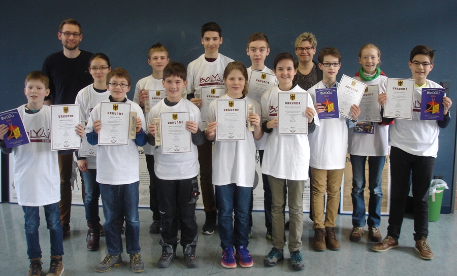 „Die Fähigkeit zur Zusammenarbeit ist ein ganz zentraler Wert unseres Lebens“ - mit diesem Slogan wirbt auch der jährlich international stattfindende Bolyai-Wettbewerb, der im Schuljahr 2016/2017 das erste Mal auch am AKG durchgeführt wurde. Das Besondere: 78 Schüler traten in 19 teilweise klassenübergreifenden Viererteams an, um gemeinsam 14 knifflige Aufgaben zu lösen. Da hierfür nur 60 Minuten Zeit waren, mussten die Teilnehmer nicht „nur“ mathematisches Verständnis und geistige Flexibilität besitzen, sondern mussten sich auch als Gruppe organisieren und die Zeit im Blick behalten - eine große Herausforderung für die teilweise noch sehr jungen Teilnehmer, die aber viele AKG-Teams erfolgreich meisterten.