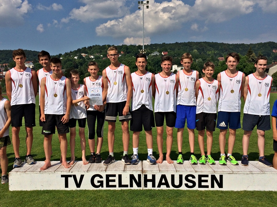 Dabei sah es zunächst gar nicht nach Platz eins im Endklassement aus. Denn trotz solider Leistungen von Nicolas Gelbarth mit 10,77 Meter und Bastian Seitz mit 10,26 Meter im Kugelstoßen, lag man zunächst nur auf Rang drei, fast 100 Punkte hinter dem vermeintlich schärfsten Konkurrenten um den Sieg, der Rhenanus-Schule Bad Sooden-Allendorf. Und obwohl David Hügel in 9,58 Sekunden und Bastian Seitz in 9,59 Sekunden über 75 Meter sehr gute Sprintleistungen zeigten, verlor man einen weiteren Platz und fand sich nach zwei Disziplinen auf Rang vier. Die Mannschaften waren aber enger zusammen gerückt, denn der Rückstand auf die Spitze betrug nun nur noch knapp 60 Punkte. Im Hochsprung setzten Julius Knatz mit starken 1,64 Meter und Benjamin Gang mit guten 1,52 Meter die Aufholjagd fort und platzierten ihre Mannschaft nach drei Disziplinen auf Rang zwei. Erstmals in Führung brachte das AKG ein tolles Ballwurf-Ergebnis. Bastian Seitz glänzte hier mit 70,0 Meter, Jonas Helfrich kam auf sehr gute 63,0 Meter. Der Weitsprung geriet dann zur Zitterpartie, denn zunächst überzeugte hier nur Nicolas Gelbarth mit 5,32 Meter. Da die beiden anderen Weitspringer, Julius Knatz und David Hügel, Probleme mit dem Anlauf hatten, fehlte zunächst das so wichtige zweite gute Disziplin-Ergebnis. Erst im letzten Versuch sprang Julius Knatz 5,02 Meter, das AKG behielt Platz eins.