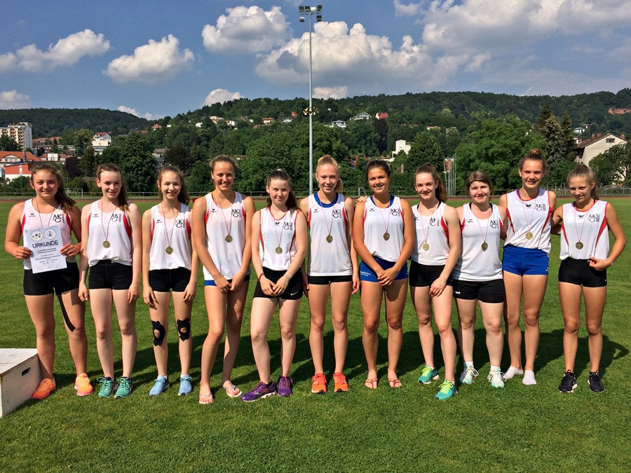 Mit einer Steigerung um fast 300 Punkte gegenüber dem Regionalentscheid, auf 6735 Punkte, holte sich die AKG-Mädchen-Mannschaft die Bronze-Medaille und erfüllte damit die eigene Erwartungshaltung. Hervorragend in Form zeigte sich im Ballwurf Liv-Grete Hartmann mit der Tagesbestweite von ausgezeichneten 54,5 Meter. Als wertvollste Punktesammlerin für ihr Team erwies sich einmal mehr Marlene Wilker, die mit 1,46 Meter im Hochsprung, 4,53 Meter im Weitsprung sowie in 2:39,05 Minuten über 800 Meter überzeugen konnte. „Bronze war heute das Maximum. Die Siegerinnen aus Kassel und auch die zweitplatzierte Schule aus Gelnhausen waren einfach stärker. Der dritte Platz ist ein tolles Ergebnis“, freute sich Sportlehrerin Ines Harjes nach dem Wettkampf.