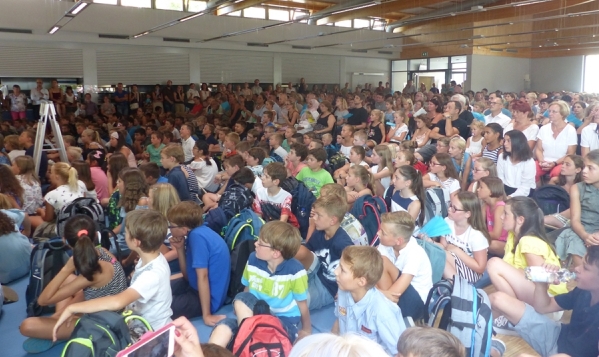 Dann war es endlich soweit: die neuen Klassen kamen auf die Bühne und das erste Klassenfoto entstand. Während die Klassen dann ihre erste Stunde im neuen Schuljahr gemeinsam mit dem Klassenlehrer oder der Klassenlehrerin verbrachten, konnten die Eltern im Elterncafé der Klassen 6 entspannen. Der Förderverein freute sich auch über viele neue Mitglieder, die mit einem AKG-T-Shirt begrüßt wurden.