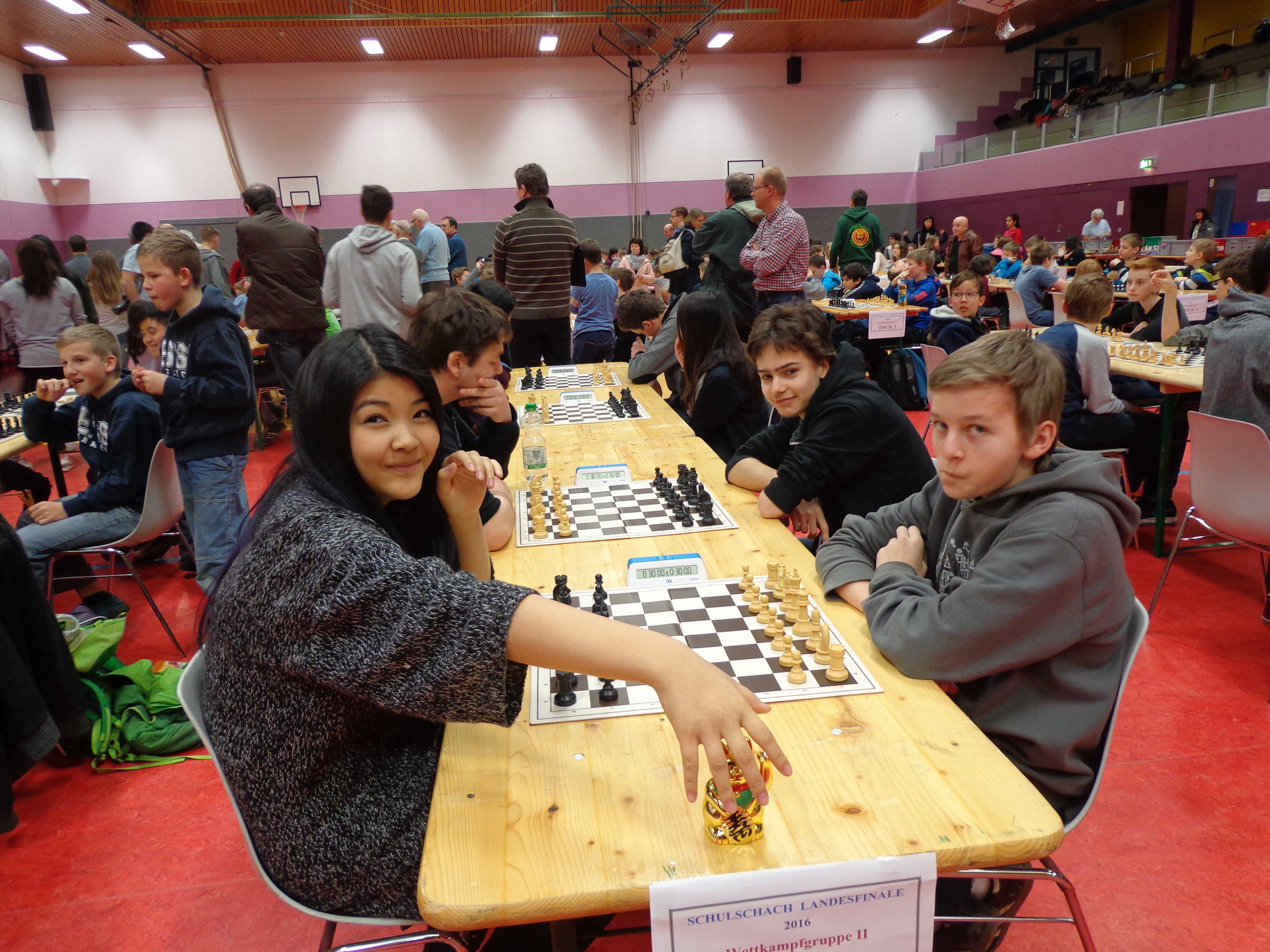 Während einer spannenden Finalrunde um den Sieg bei der diesjährigen Hessenmeisterschaft im Schulschach in der Wettkampfklasse II (U 16) belegte das AKG-Team den zweiten Platz. Vier Mannschaften aus ganz Hessen hatten sich in jeweils zwei vorherigen Runden ihren Platz im Finale gesichert. Das AKG-Team, bestehend aus Phil Thomsen, Frederic Kaiser, Mai Linh Le und Till Gehlhar, war angetreten, um den Erfolg aus dem Vorjahr (Hessenmeister) zu wiederholen. Bedingt durch den Abgang von Yannick Keller an Brett zwei und die starke Konkurrenz war jedoch bereits im Vorfeld klar, dass es diesmal mindestens genauso schwer werden würde: So hatten die Bensheimer bereits in der vorherigen Runde gegen die Mannschaft aus Gernsheim den Kürzeren gezogen und konnten sich nur als Zweitplatzierte des Halbfinales für die Finalrunde qualifizieren. Dort stand direkt in der ersten Runde das "Rematch" gegen Gernsheim an. Doch während sich das AKG-Team im Schulschachpokal im November 2015 noch gegen die Konkurrenz durchsetzen konnte, hatten die Bensheimer wie bereits im Halbfinale erneut das Nachsehen: 3 : 1 hieß es nach der ersten Runde für die Gernsheimer, nur Phil Thomsen an Brett 1 konnte sich mit den weißen Steinen gegen seine Gegnerin durchsetzen.