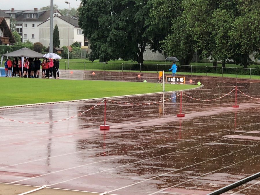 Die ganze „Dramaturgie“ des Wettkampfs lässt sich schwer beschreiben. Noch vor Beginn des Aufwärmens fing es an zu regnen. Der Niederschlag intensivierte sich, teilweise schüttete es wie aus Eimern. Dadurch fanden die 100 Meter, der Weitsprung, das Kugelstoßen und das Speerwerfen unter sehr schwierigen Verhältnissen statt. Alle Teilnehmer, Betreuer und auch die Kampfrichter waren klatschnass. Aus dem Kugelstoß-Ring musste immer wieder das Wasser gekehrt werden, die Anlaufbahnen für Weitsprung und Speerwurf waren rutschig. Den Hochsprung hatte die Wettkampfleitung aus Sicherheitsgründen abgebrochen und auf den Nachmittag verschoben.