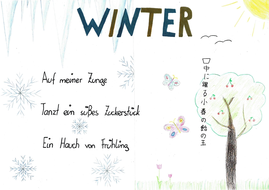 Bei der Auseinandersetzung mit den japanischen Schriftzeichen haben die Schüler entdeckt, dass in den Haikus sowohl Kanji (eine Symbolschrift) als auch Hiragana (eine Silbenschrift) verwendet werden. Anschließend haben sie die Gedichte aus dem Englischen ins Deutsche übersetzt und dabei versucht, die Form aus 5-7-5 Silben zu erhalten. Einige Schüler haben ihre Übersetzungen in den Weihnachtsferien noch graphisch gestaltet.
