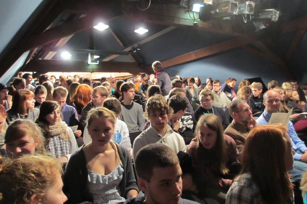 In der Regel findet eine Probe pro Woche statt, zurzeit donnerstags zwischen 15.40 und 17:30. Die Probe besteht meistens aus Aufwärmspielen, Stimmübungen und Improvisation – hauptsache loslassen und vom Alltag frei machen – und natürlich der Arbeit am jeweils aktuellen Stück. Vor den Aufführungen (meist Anfang Mai) werden die Proben zahlreicher und es kommen nach Absprache Fototermine und Wochenendproben dazu. Im Februar fahren wir zusammen für eine Theaterfreizeit in die Jugendherberge in Ernsthofen. Dort arbeiten wir nicht nur intensiv an unseren Charakteren und am Stück sondern feiern, machen crazy Impro-Spiele und stärken den Gruppenzusammenhalt.