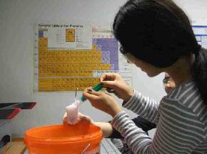 Auch das AKG war in diesem Jahr mit gleich drei Gruppen vertreten und begeisterte vor allem die jüngeren Besucher aus den Grundschulen durch tolle Mitmach-Angebote: Während die Schülerinnen der INext-AG unter der Leitung von Herrn Treubert-Zimmermann erste Schritte bei der Arbeit mit der Micropipette ermöglichten, präsentierten die Oberstufen-Schülerinnen und -Schüler des Chemie-Leistungskurses unter der Leitung von Herrn von Lehmden, wie man mithilfe von Algen-Extrakt ein Paprika-Imitat herstellt, welches in den aus dem Supermarkt bekannten gefüllten Oliven steckt. (Großer Beliebtheit erfreuten sich dabei besonders die bunten "Algen-Würmer", die die Nachwuchs-Chemiker mithilfe von Spritzentechnik selbst herstellen konnten.) In der Physik regten zahlreiche Mitmach-Experimente (z.B. zu Stromkreisen und Hebelgesetzen) die Neugier der Besucher an, sodass Frau Riederer und Frau Jordan alle Hände voll zu tun hatten!