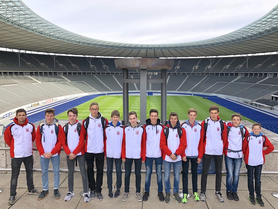 Das Bild zeigt die Leichtathletik-Schulmannschaft der Jungen in der Wettkampfklasse III als hessischen Landessieger beim Bundesfinale JtfO 2018 im Berliner Olympiastadion.